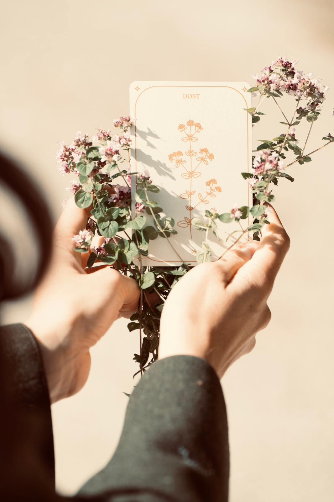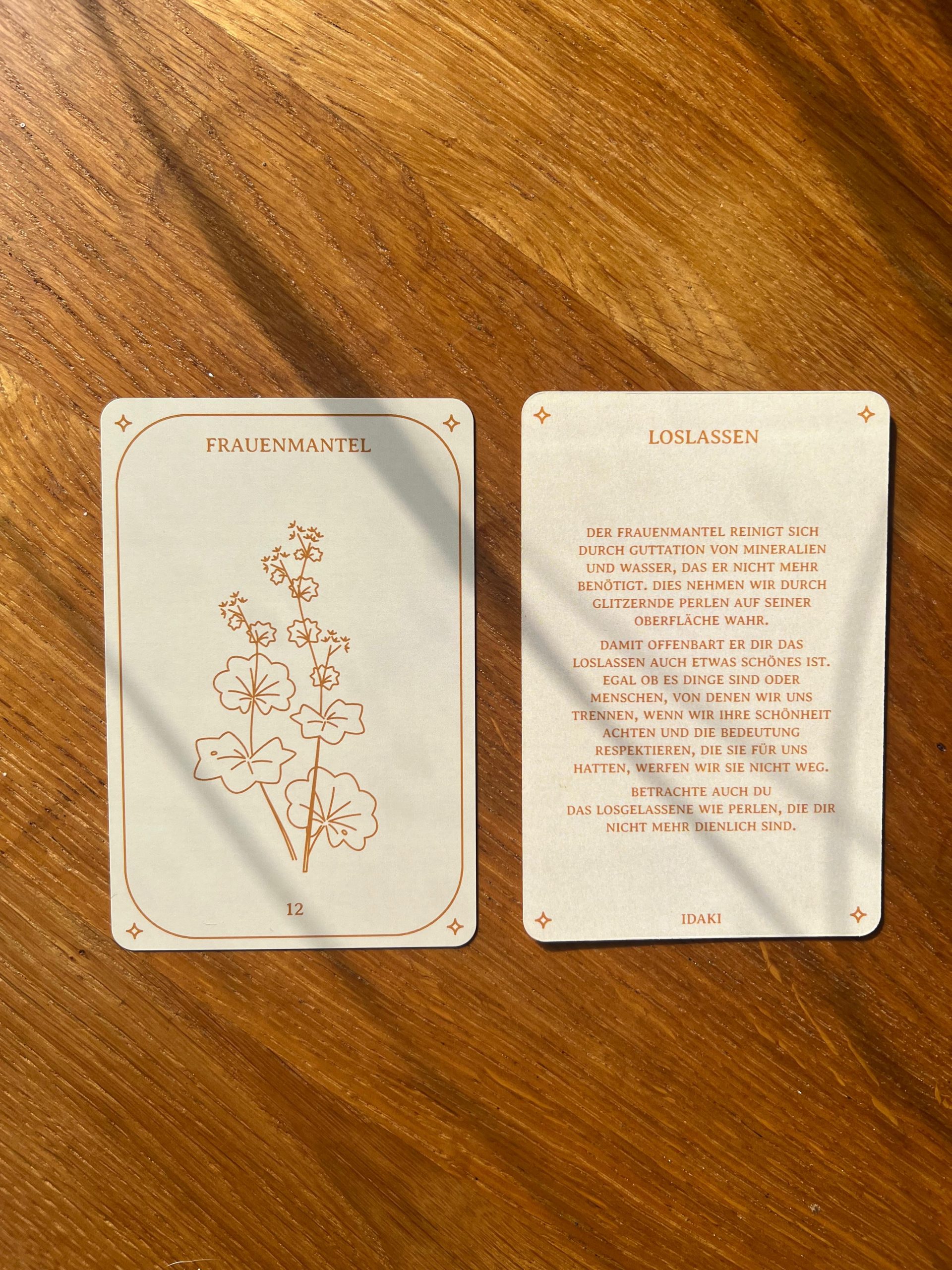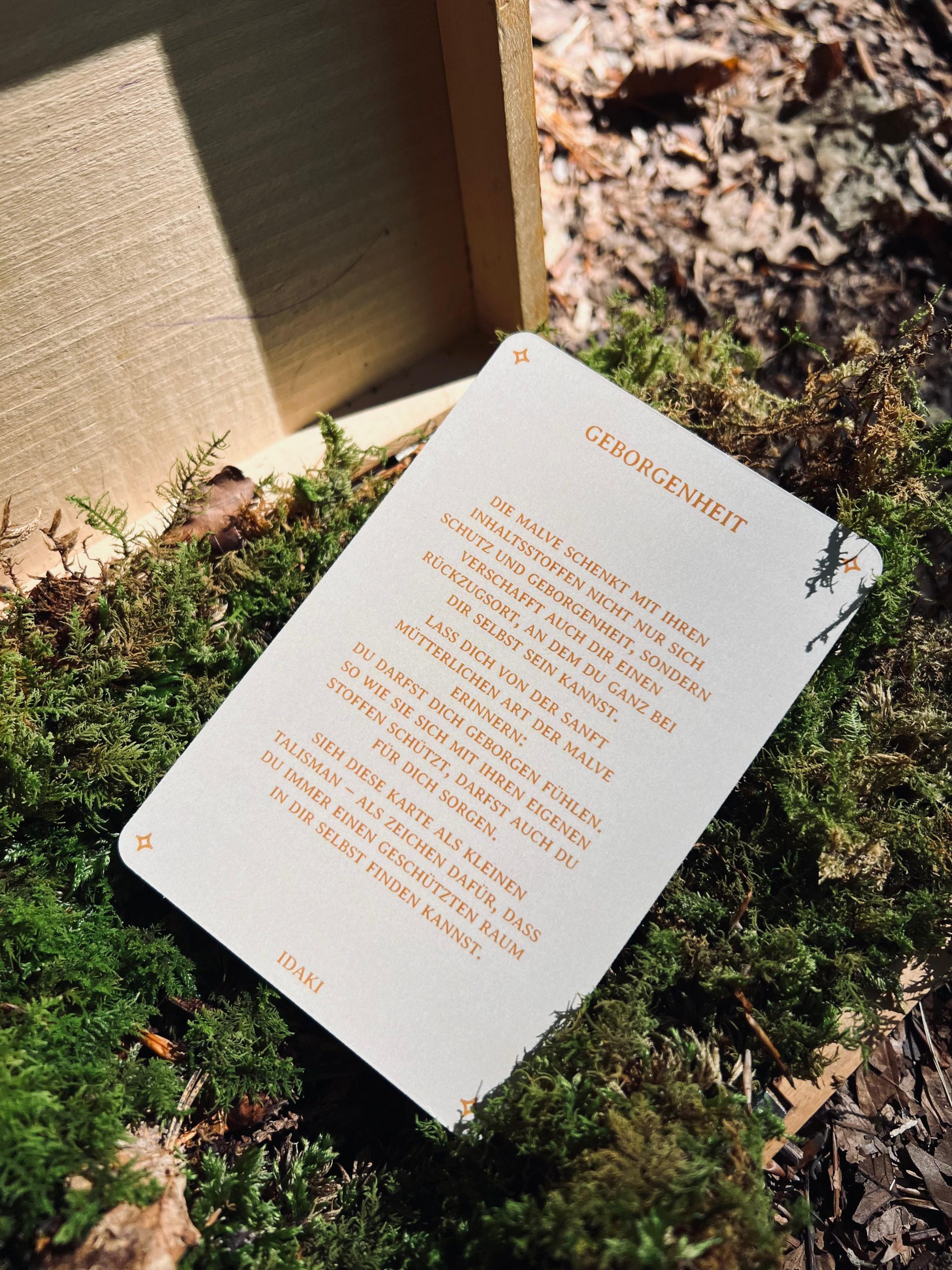 Das Kartenset Idaki‘s Krautgeflüster soll dir inspirierende Impulse geben und schenkt dir eine achtsame Verbindung zwischen dir und der Pflanze.